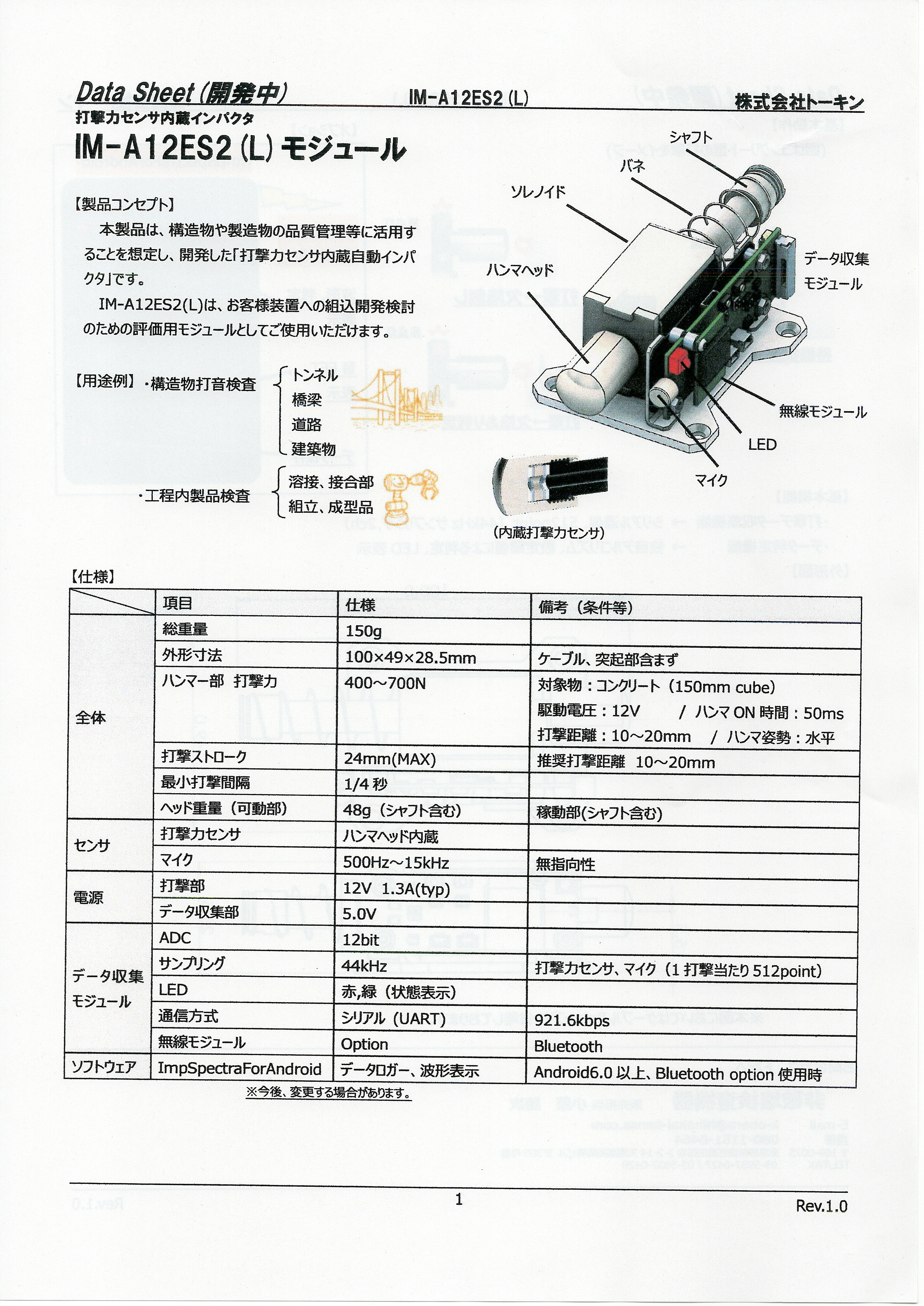 本製品は、構造物や製造物の品質管理等に活用することを想定し、開発した「打撃カセンサ内蔵 インパクタ」です。IM-A12ES2(L)は、お客様装置への組込開発検討のための評価モジュールとしてご使用いただけます。