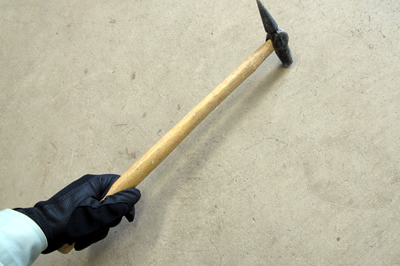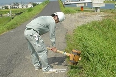 打音検査 コンクリート部材、附属物、タイル等の表面をハンマーで叩き、音の違い(滑音・濁音)でうき・はく離箇所を特定します。はく落の恐れのあるうき・はく離はただちに叩き落します。 |