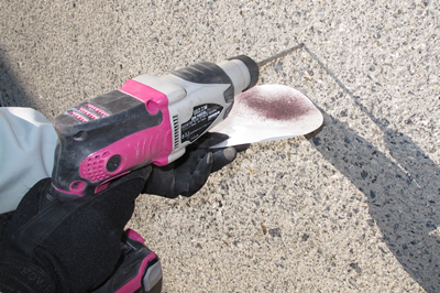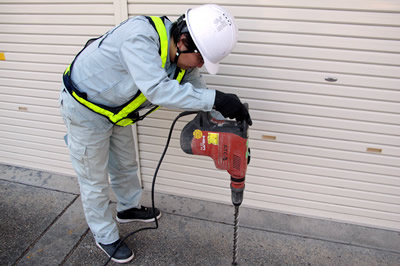 中性化深さ試験(ドリル法) 中性化深さの測定に電動ドリルの削孔粉を用いることで、従来のコアを用いる方法より簡易的に試験を行います。 |