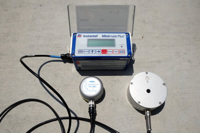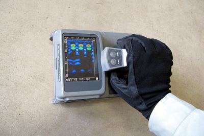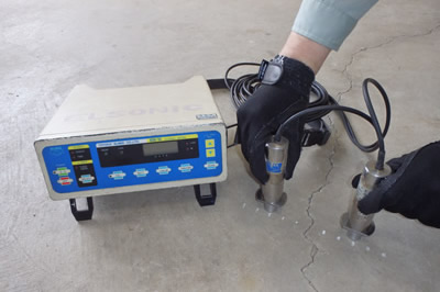 超音波測定 コンクリート表面に設置した発振子によって内部に弾性波を発生させ、これをコンクリート表面の受信子で測定する手法です。 |