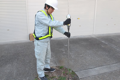 簡易貫入試験 正式には「簡易動的コーン貫入試験」といい、試験機を用いて原位置における地盤の貫入抵抗を求め、簡易な支持力判定に用います。 |