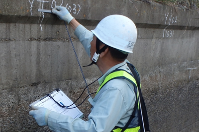 目視点検 土木構造物、建築構造物などの表面の変状、全体の変形、周辺の環境状況等を調査します。変状について緊急対策の必要性、変状原因の推定、詳細調査の提案等を行います。 |
