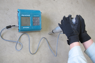 リバウンドハンマー試験 コンクリートの表面をリバウンドハンマーによって打撃し、その反発度から圧縮強度を求める方法です。 |